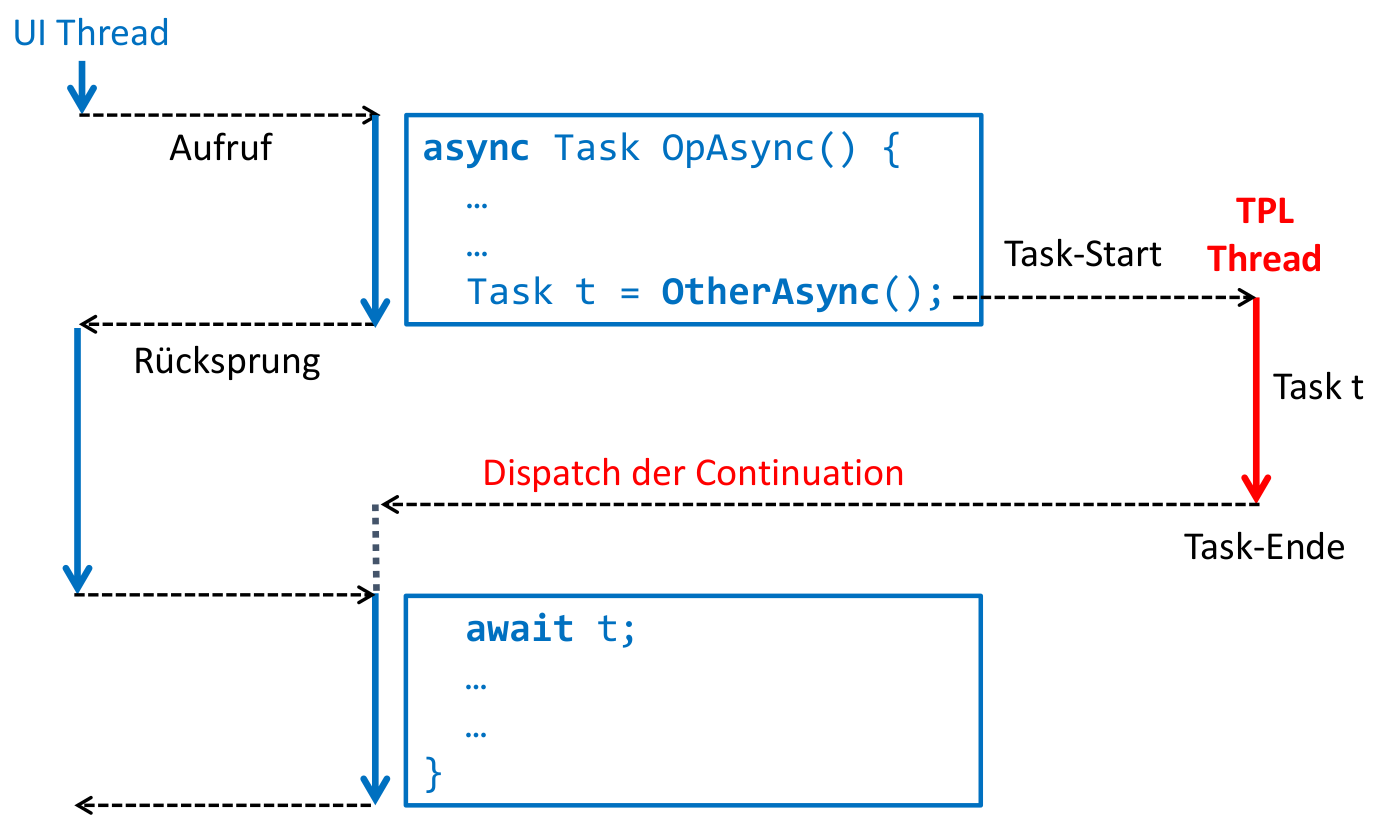 awaitwird alles synchron, nacher asynchron (beliebiger Thread, ausser wenn Aufrufer UI-Thread ist)