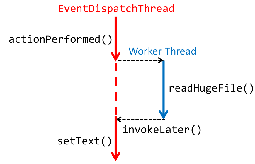 button.addActionListener(event -> { // GUI-thread new Thread(() -> { String text = readHugeFile(); SwingUtilities.invokeLater(() -> { // GUI Thread textArea.setText(text); }); }).start(); });